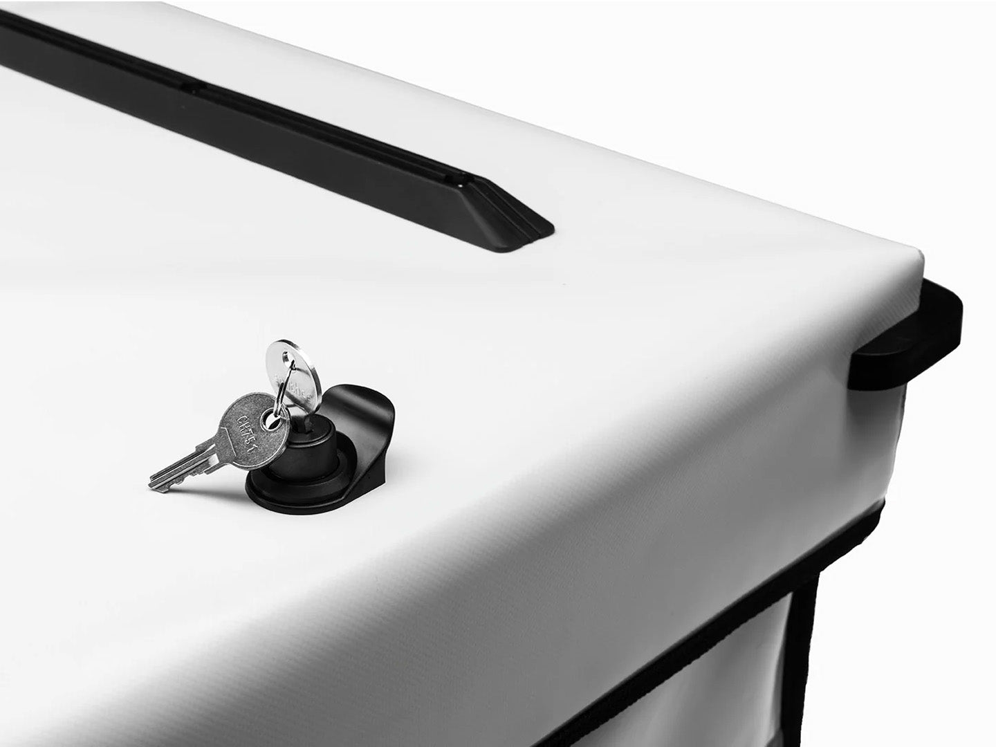 BagPRO er fuldstændig vandtæt og udstyret med et forstærket låg-/coversystem. Den dæmper vibrationer og stød, så indholdet forbliver sikkert og stabilt under transport. Låget gør det også muligt at laste større genstande ovenpå.