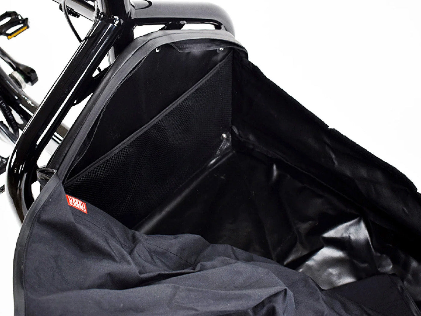 Når den er lukket, fylder Fahrer Hood blot tre centimeter i bredden og fungerer samtidig som en komfortabel ryglænspanel på ladcyklen. Når du skal bruge den, åbnes lynlåsen, og tasken foldes ud og fastgøres til frontpanelet.